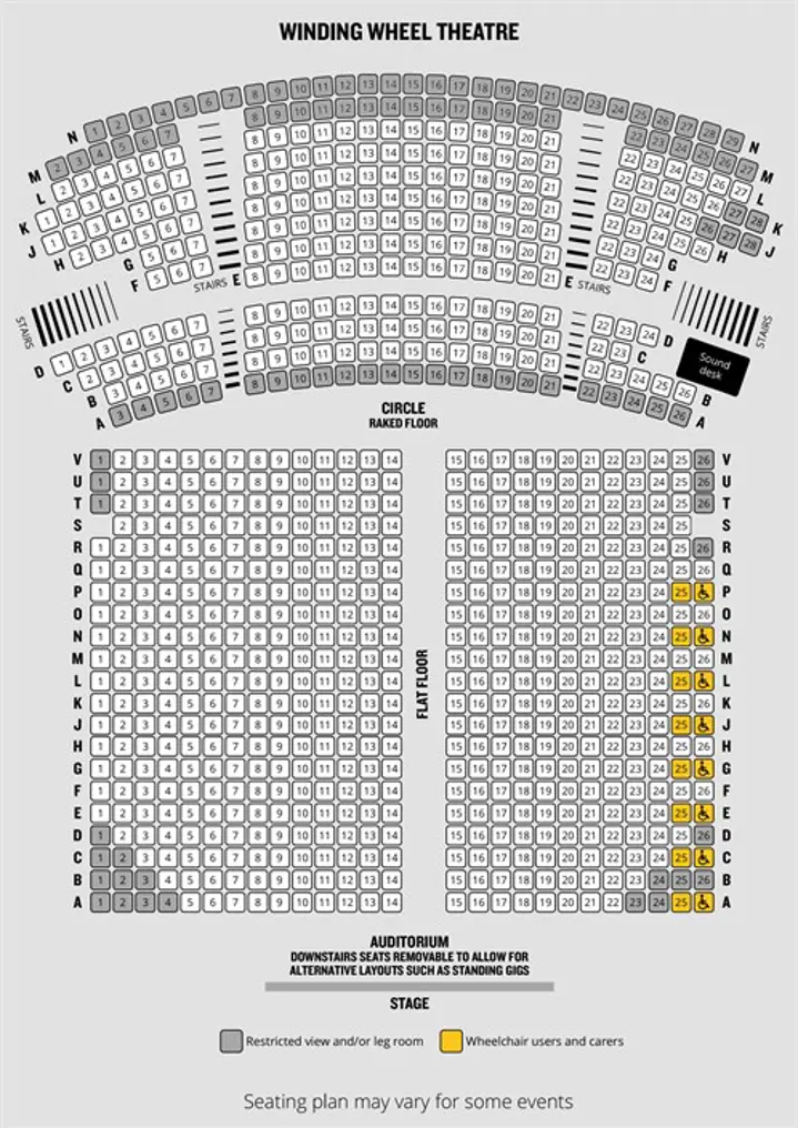 This is the standard seating plan for the Winding Wheel Theatre. The plan may differ depending on the event.